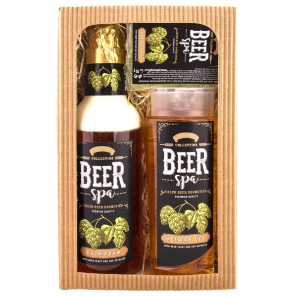 Dárkové balení pivní kosmetiky Beer Spa s extrakty z pivních kvasnic a chmele obsahuje sprchový gel 250 ml, koupelovou pěnu 500 ml a ručně vyráběné mýdlo 70 g. Pivní lázně u vás doma.