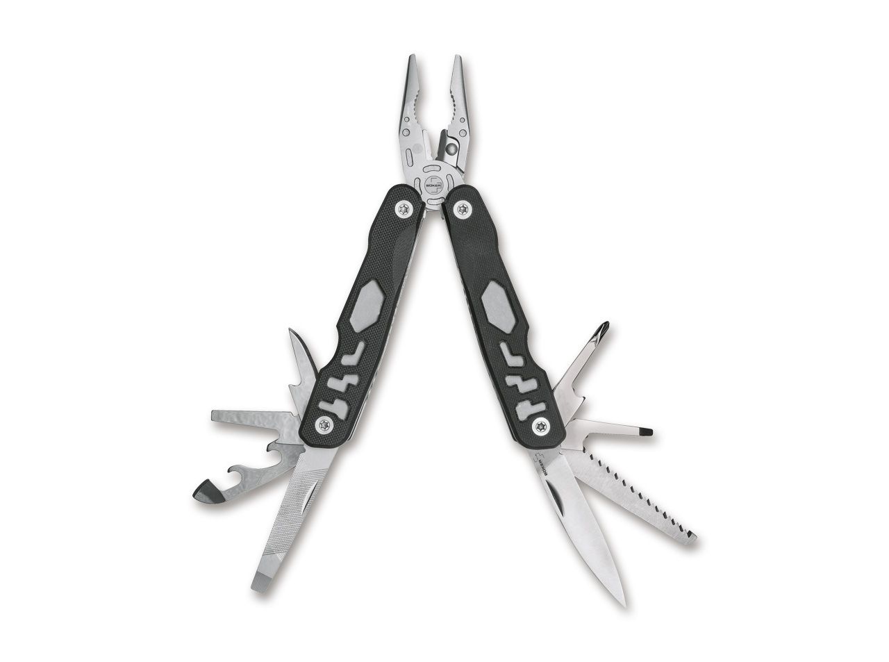 Böker Plus Specialist I je praktický multifunkční nůž s mnoha různými nástroji a spolehlivým mechanismem pojistky Backlock proti nechtěnému zavření nože při používání. Pružinové kleště zvládnou i náročné požadavky a nabízejí také zesílenou štípačku drátu. Mají plochý uchopovací povrch kleští s dlouhým nosem a oválnou část pro uchycení vnějších šestihranných šroubů, matic a trubek. Nástroje zasunuté do obou rukojetí lze snadno otevřít a díky robustnímu zajišťovacímu mechanismu je lze bezpečně používat. Nástroj je vybaven úzkou čepelí, pilkou na dřevo, otvírákem na konzervy, otvírákem na láhve, ohýbačem/odizolovačem vodičů, šídlem, šroubovákem s hlavou Phillips a velkým a malým plochým šroubovákem. Ploché střenky rukojeti G10 mají ozdobné výřezy a jemnou texturu pro bezpečné uchopení. Dodává se s kvalitním nylonovým pouzdrem na opasek.