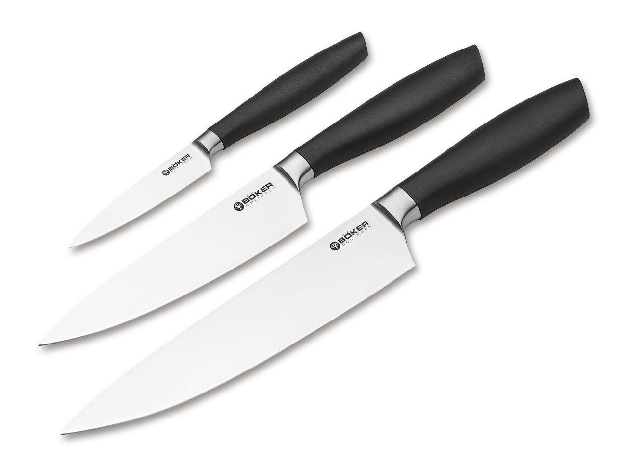 Co mají společné Trier, Wiesbaden, Münster a Lüneburg? Kromě historického centra města, pamětihodností, které jsou proslulé za hranicemi regionu a dlouhodobou tradicí jako významných obchodních měst, sdílejí další důležitý aspekt: Tato města disponují vynikajícími obchodníky s ocelářskými výrobky, kteří si vybudovali vynikající pověst během mnoha let díky rozsáhlému výběru a prvotřídní odbornosti. Využili jsme desetiletí zkušeností, vynikajícího know-how a porozumění pro každodenní požadavky a potřeby nadšenců do vaření a společně s našimi 150letými zkušenostmi s výrobou nožů v Solingenu jsme dali vzniknout sérii Böker Core. Výsledkem je produkt s dynamickými liniemi, vynikající manipulací a úchvatnými řeznými schopnostmi, které získaly hodnocení kvality "doporučené předními prodejci". Pevná čepel vyrobená z chróm-molybden-vanadové oceli (X50CrMoV15), která se dokonale hodí k výrobě špičkových kuchyňských nožů, je ručně kovaná v Solingenu, strukturálně optimalizovaná a pak vytvrzena na 58 HRC. K tomu, abychom u čepele dosáhli delší životnosti a dokonce jemnějšího řezu, slouží naše tradiční ruční ostření vyleštěné do vysokého lesku. Kovaný bolster zajišťuje bezpečné uchopení a chrání uživatele před možnými zraněními v případě skluzu. Zvláštním designem všech nožů této série je jemně zaoblená zadní strana čepele. Díky tomu je nůž příjemný na manipulaci, snadno se používá v libovolné poloze a zabraňuje nepříjemnému tlaku na ruku - a to i při silném tlaku na zadní hranu čepele, například při provádění sekání. Praktický a dokonale vyvážené rukojeti ze syntetického materiálu dotváří celkový obraz. Nože jsou vysoce odolné vůči vlhkosti a lze je bez váhání použít i v profesionálních restauracích. Zejména v kuchyni musí hygiena vždy splňovat nejvyšší standardy. Do našeho sortimentu jsme přidali třídílnou sadu nožů, která představuje dokonalý startovací set pro ambiciózní kuchaře. Sada je dodávána v elegantní dárkové krabičce a obsahuje následující produkty: Velký kuchyňský nůž, malý kuchyňský nůž a nůž. Do našeho sortimentu jsme přidali třídílnou sadu nožů, která představuje dokonalý startovací set pro ambiciózní kuchaře. Sada je dodávána v elegantním dárkovém boxu a obsahuje následující produkty: Velký kuchyňský nůž, malý kuchyňský nůž a univerzální nůž.