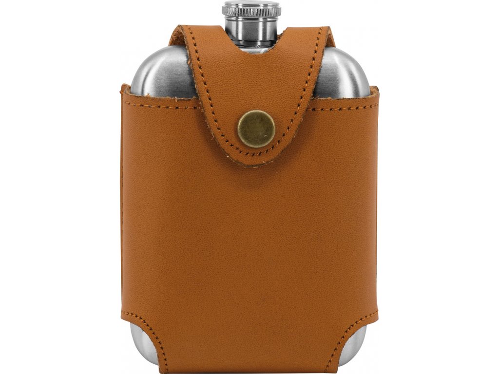 Kapesní placatka 97124 Meex Club s hnědým koženým pouzdrem připinatelným na opasek.