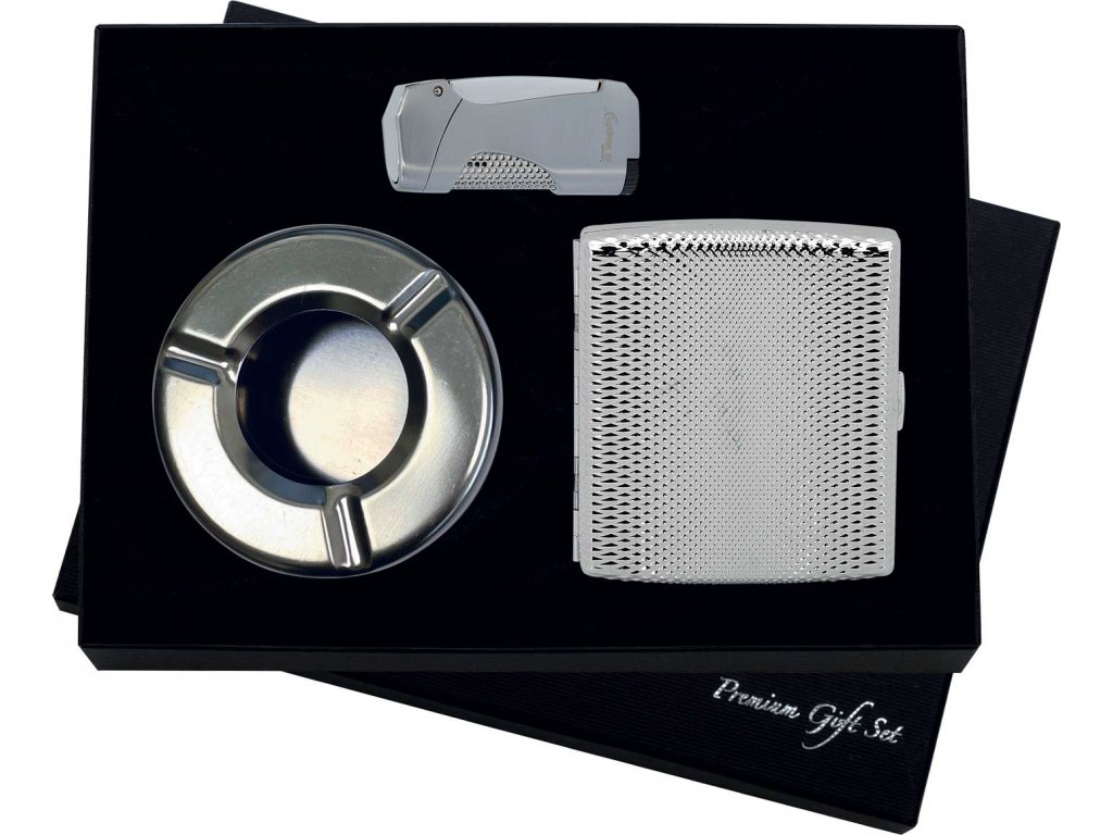 Dárková sada s popelníkem, tabatěrkou a zapalovačem.