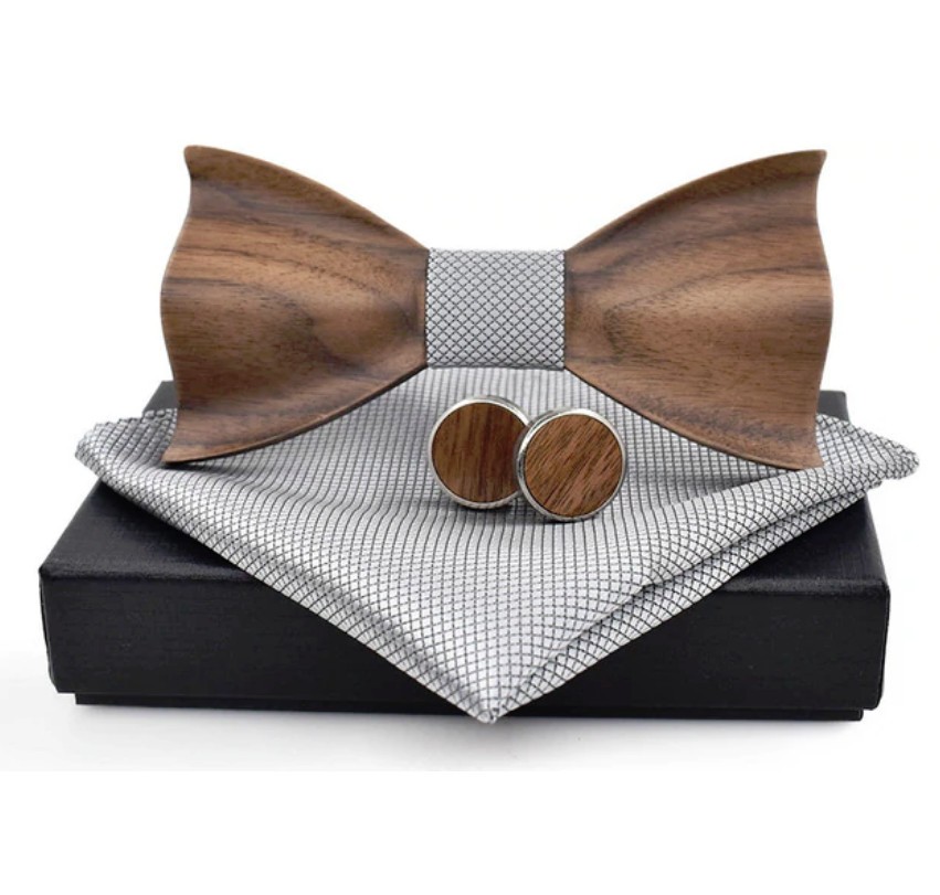 Dřevěný motýlek s kapesníčkem a manžetovými knoflíčky 709071Skladem/K odeslání730 Kč/ ks603 Kč bez DPH