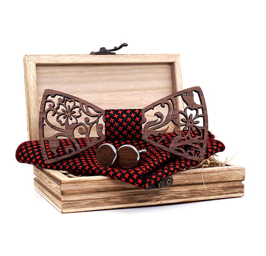 Designový motýlek z přírodního materiálu pro každého moderního muže. Originální provedení v kombinaci dřeva a textilu. Součástí motýlku je kapesníček, manžetové knoflíčky a dárková kazeta.