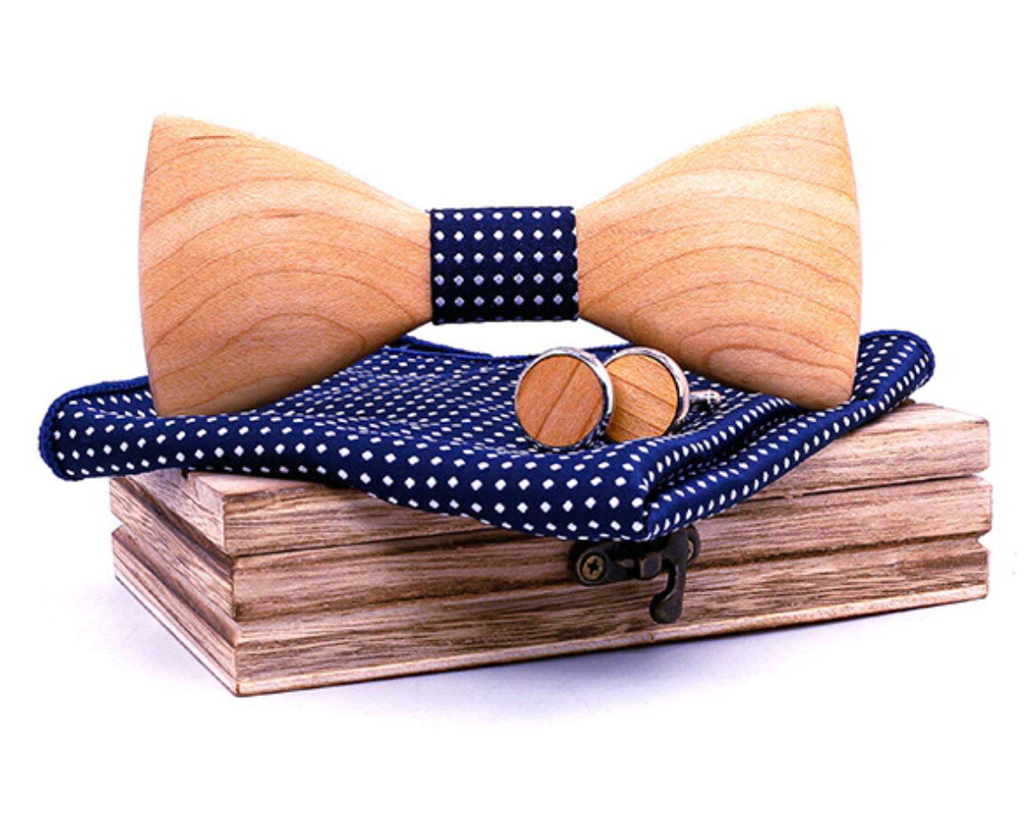 Designový motýlek z přírodního materiálu pro každého moderního muže. Originální provedení v kombinaci dřeva a textilu. Součástí motýlku je kapesníček a manžetové knoflíčky.