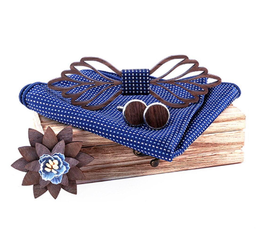 Designový motýlek z přírodního materiálu pro každého moderního muže. Originální provedení v kombinaci dřeva a textilu. Motýlek je ozdoben frezkou. Součástí setu je také kapesníček, manžetové knoflíčky a brož ve tvaru květu.