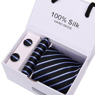 Pánská dárková souprava obsahuje kravatu, kapesníček a manžetové knoflíčky, vše ve stejném barevném i materiálovém provedení. Kravata je velmi příjemná na dotek, dělá dobrý dojem. Manžetové knoflíčky se nosí ke košilím, které mají zesílené lemy rukávů. Vše je baleno v bílé dárkové krabičce.