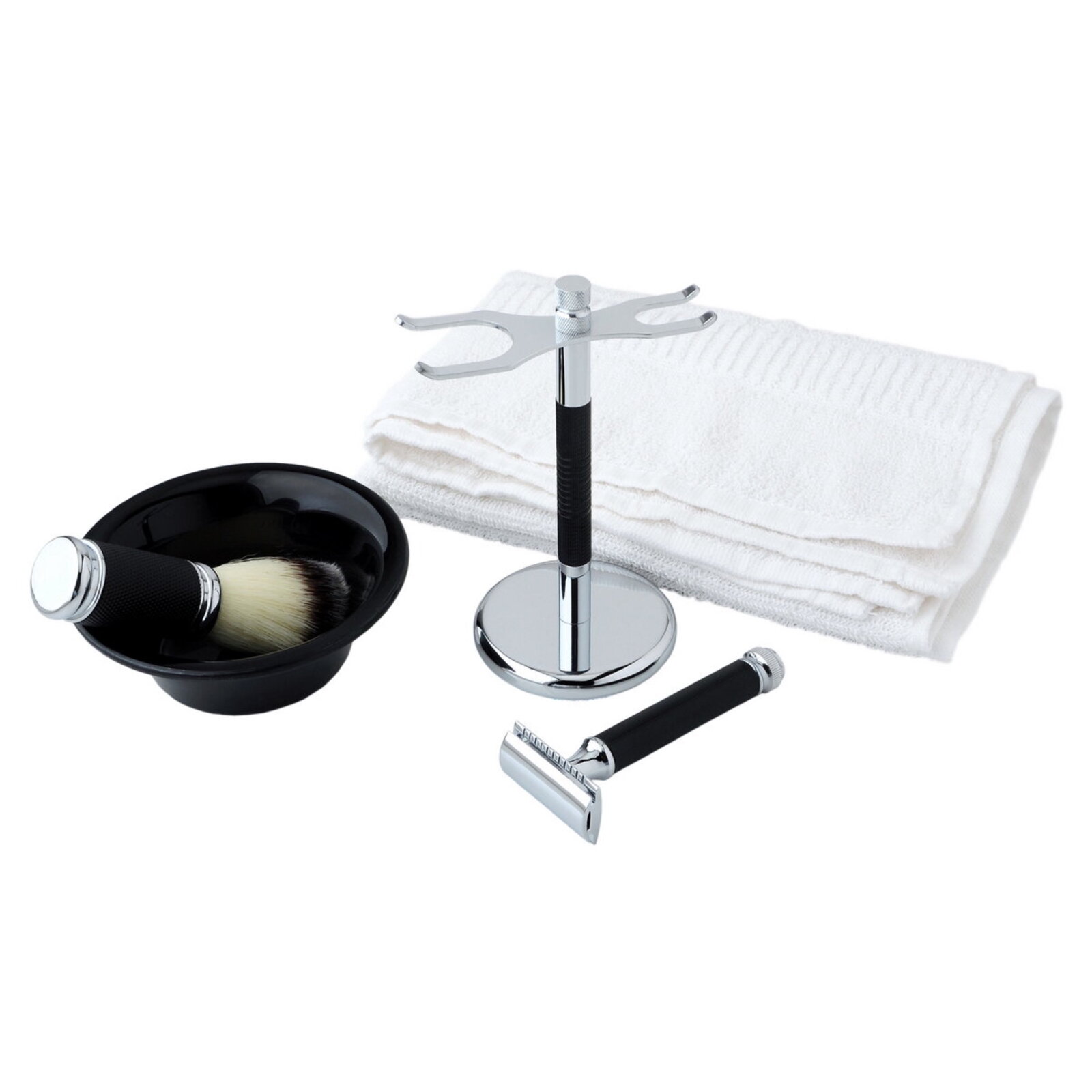 Krásná pětidílná sada na holení značky Gaira®. Stříbrné kovové části jsou vyrobeny z mosazi a jsou pochromované nebo poniklované. Štětka je vyrobena ze syntetických štětin. Je určena pro všechny, kteří mají při přípravě na holení rádi masážní efekt.