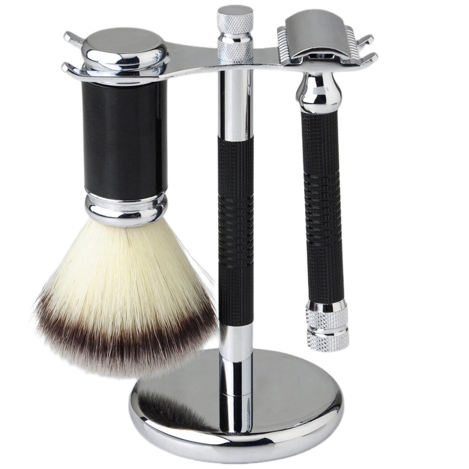 Krásná třídílná sada na holení značky Gaira. Stříbrné kovové části jsou vyrobeny z mosazi a jsou pochromované nebo poniklované. Štětka je vyrobena ze syntetických štětin. Je určena pro všechny, kteří mají při přípravě na holení rádi masážní efekt