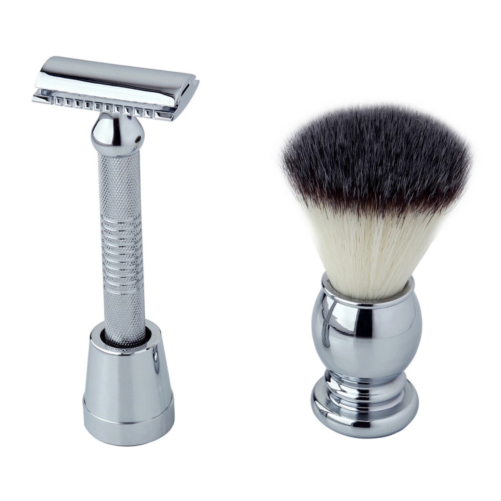 Krásná třídílná sada na holení značky Gaira. Sada se vyznačuje baňatým tvarem rukojeti štětky. Stříbrné kovové části jsou vyrobeny z mosazi a jsou pochromované nebo poniklované. Štětka je vyrobena ze syntetických štětin. Je určena pro všechny, kteří mají při přípravě na holení rádi masážní efekt