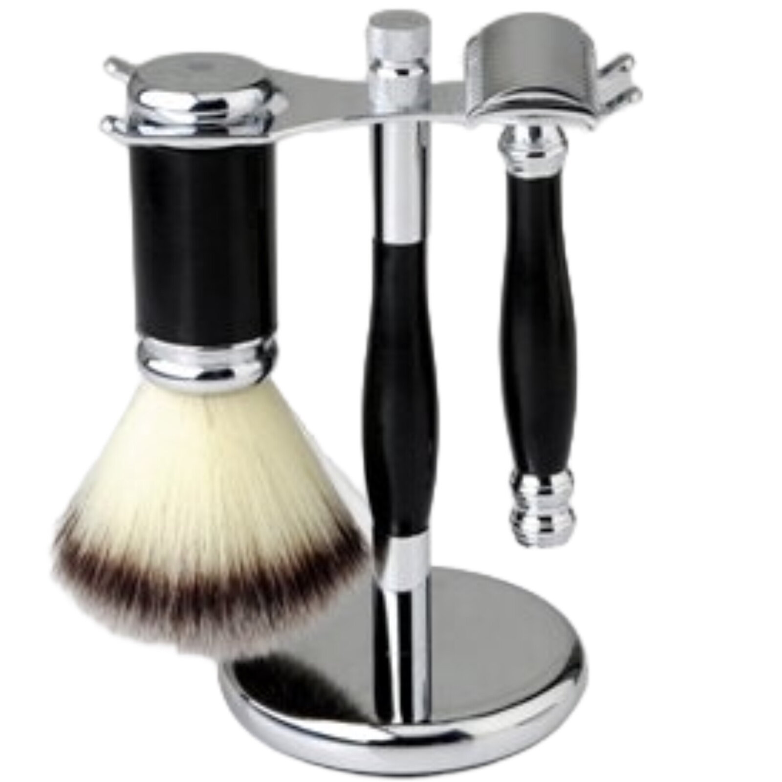 Krásná třídílná sada na holení značky Gaira. Stříbrné kovové části jsou vyrobeny z mosazi a jsou pochromované nebo poniklované. Štětka je vyrobena ze syntetických štětin. Je určena pro všechny, kteří mají při přípravě na holení rádi masážní efekt