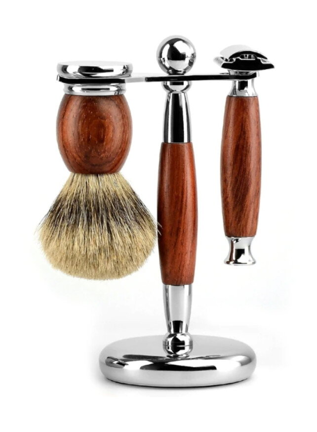 Krásná třídílná sada na holení značky Gaira. Sada se vyznačuje baňatým tvarem rukojeti štětky. Stříbrné kovové části jsou vyrobeny z mosazi a jsou pochromované nebo poniklované. Štětka je vyrobena z čistých jezevčích štětin. Je určena pro všechny, kteří mají při přípravě na holení rádi masážní efekt.