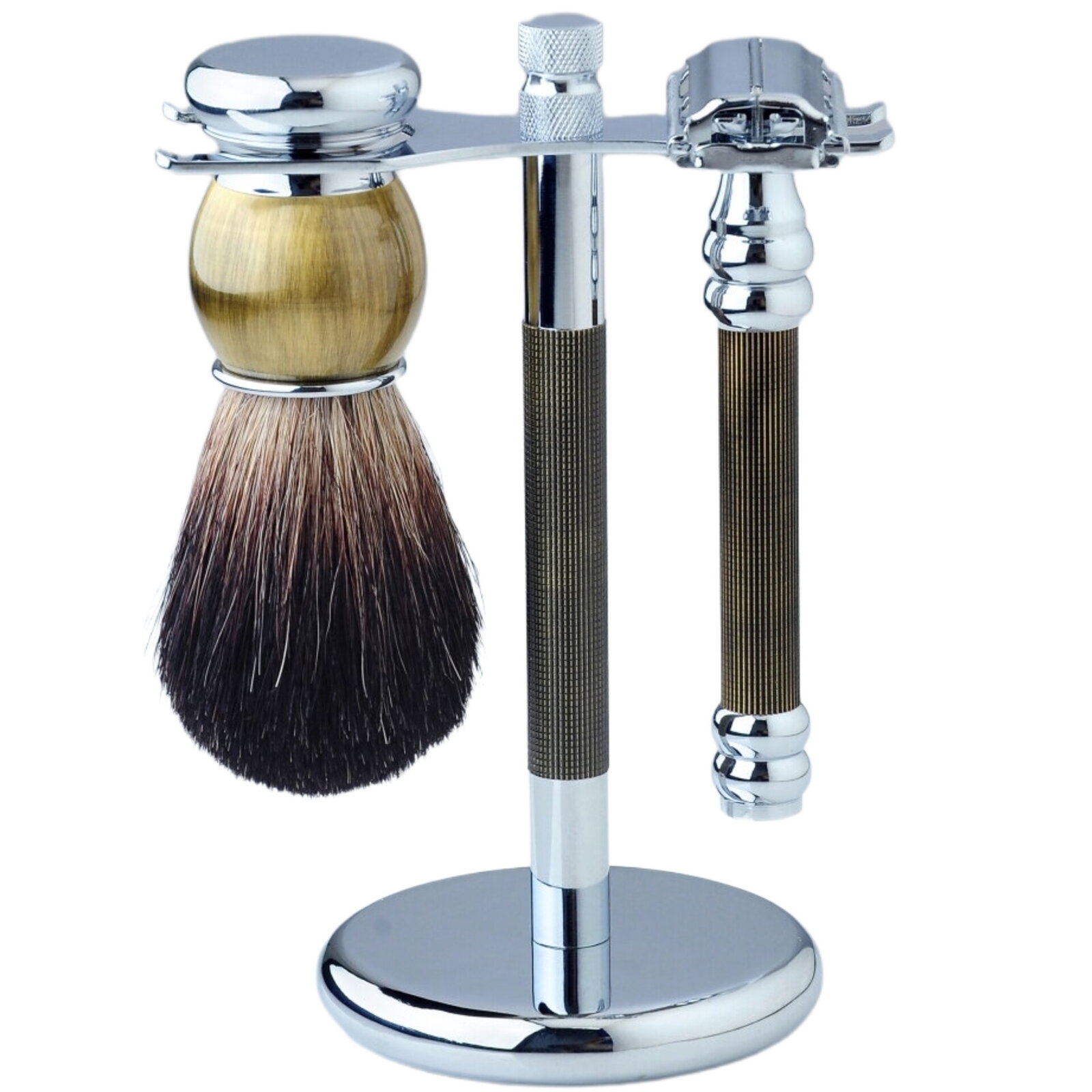 Krásná třídílná sada na holení značky Gaira. Sada se vyznačuje baňatým tvarem rukojeti štětky. Stříbrné kovové části jsou vyrobeny z mosazi a jsou pochromované nebo poniklované. Štětka je vyrobena z čistých jezevčích štětin. Je určena pro všechny, kteří mají při přípravě na holení rádi masážní efekt.