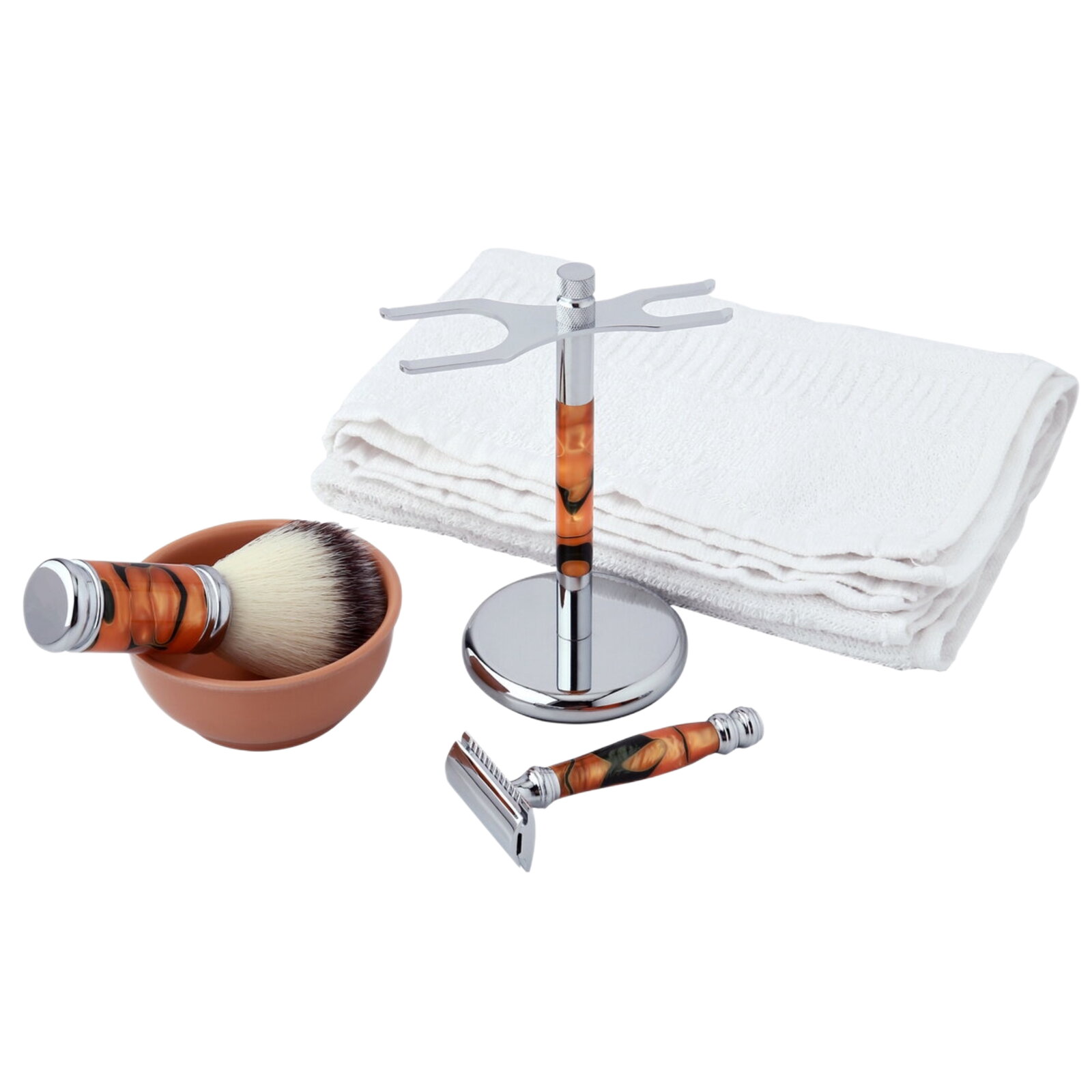 Krásná pěti-dílná sada na holení značky Gaira®. Rukojeti jsou zhotoveny v imitaci želvoviny. Stříbrné kovové části jsou vyrobeny z mosazi a jsou pochromované nebo poniklované. Štětka je vyrobena ze syntetických štětin. Je určena pro všechny, kteří mají při přípravě na holení rádi masážní efekt.