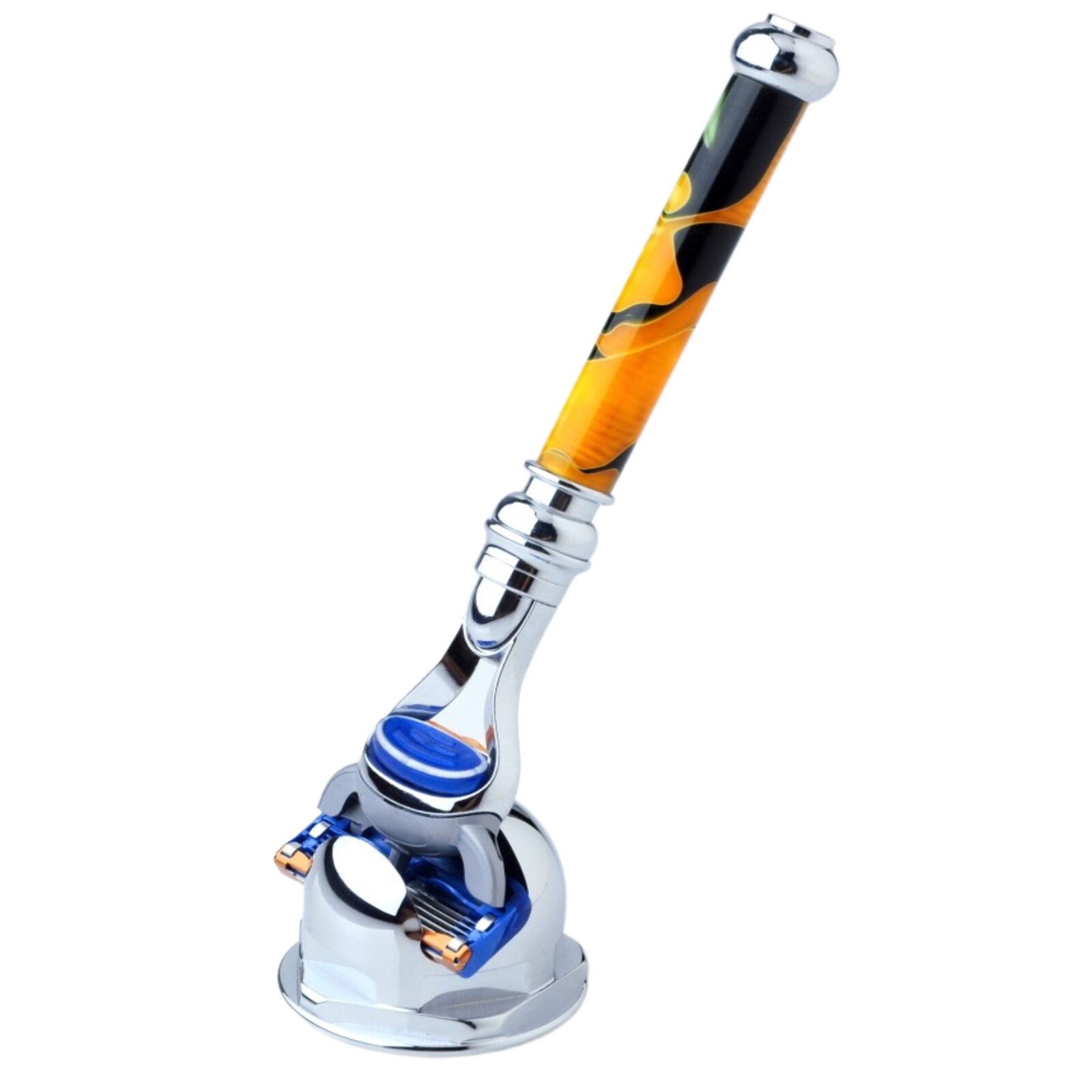 Praktický stabilní kovový stojánek na holicí strojek s hlavicí Fusion. Stojánek je vyroben z pochromovaného kovu. Holicí strojek na obrázku není součástí stojánku.
