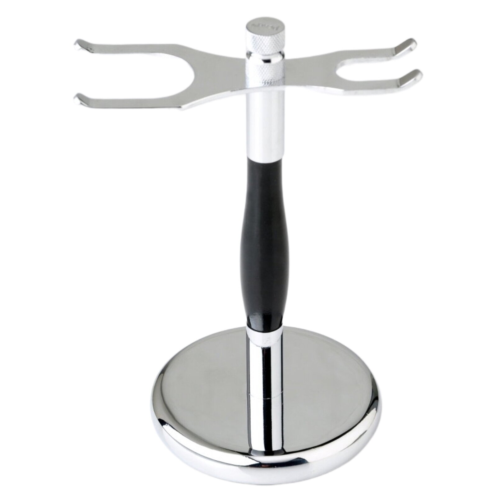 Kvalitní kovový stojánek na štětku na holení a holicí strojek. Štětka na holení by měla po použití vysychat štětinami dolů. Tím zabraníme hromadění vody v rukojeti, což může způsobit deformaci štětin.