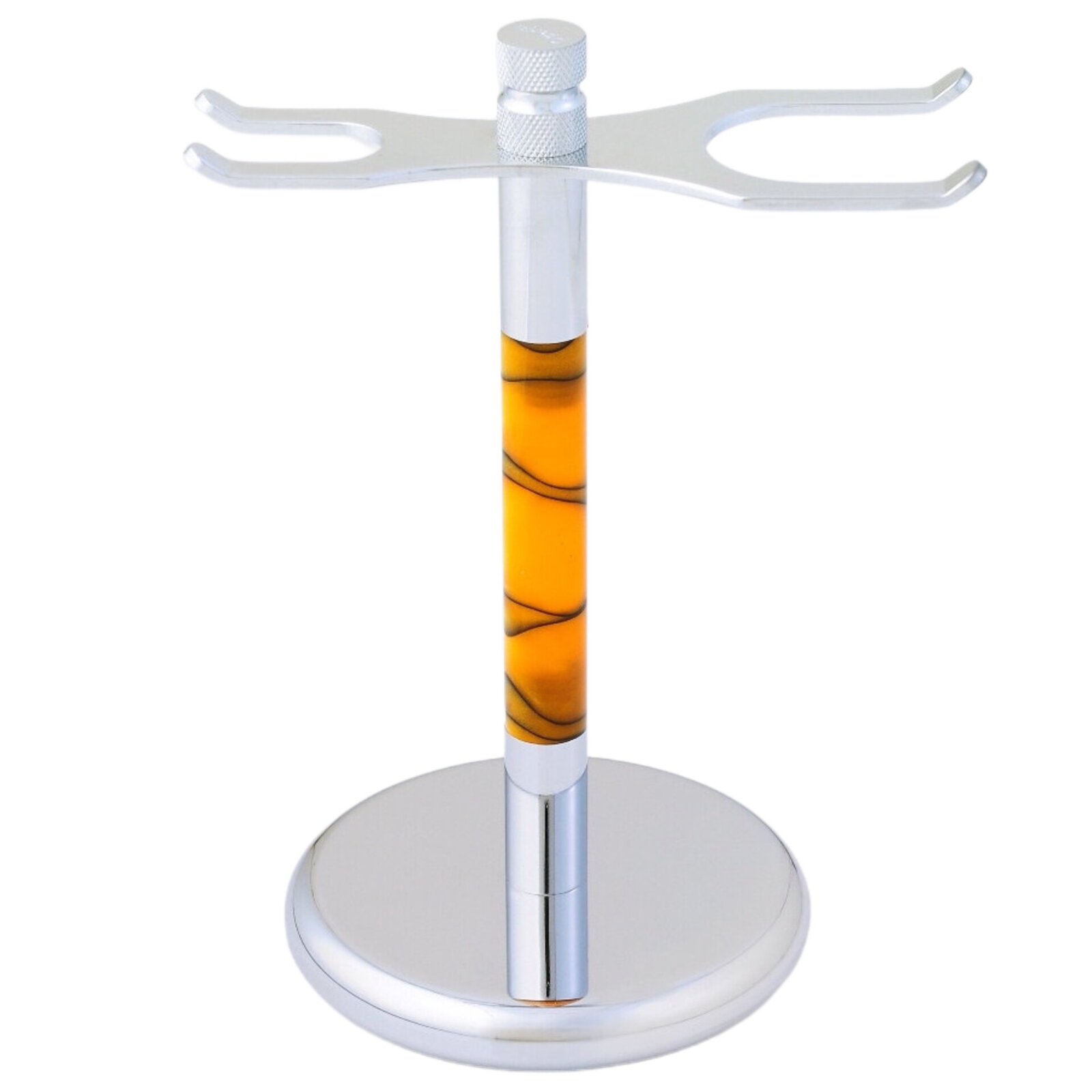 Kvalitní kovový stojánek na štětku na holení a holicí strojek. Štětka na holení by měla po použití vysychat štětinami dolů. Tím zabraníme hromadění vody v rukojeti, což může způsobit deformaci štětin.