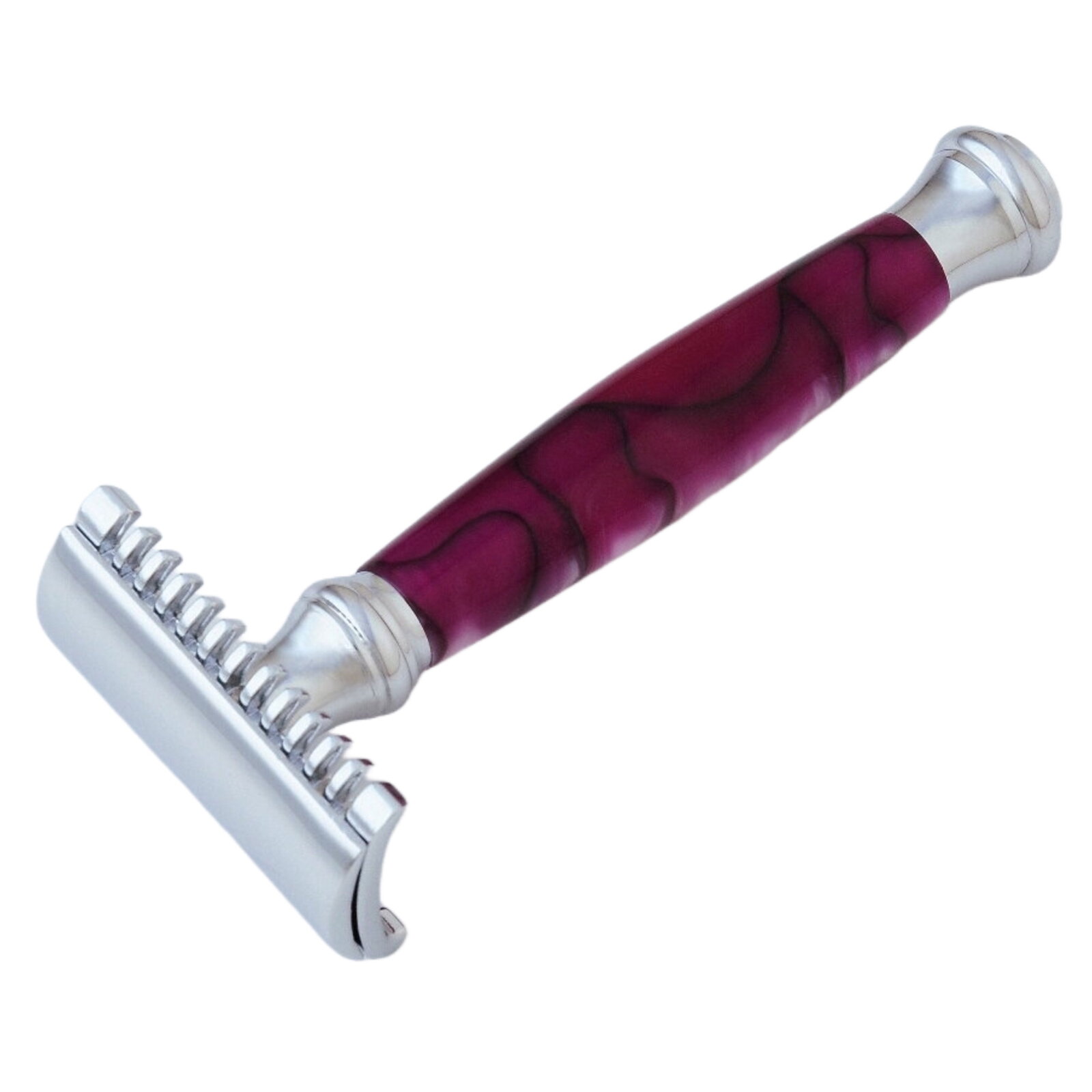 Elegantní holicí strojek na klasické žiletky. Díky propracovanému designu se strojek příjemně drží. Kovové díly jsou vyrobeny z mosazi a pochromované. Hlava strojku je šroubovací, s plnou lištou, která je vhodná pro každodenní holení.