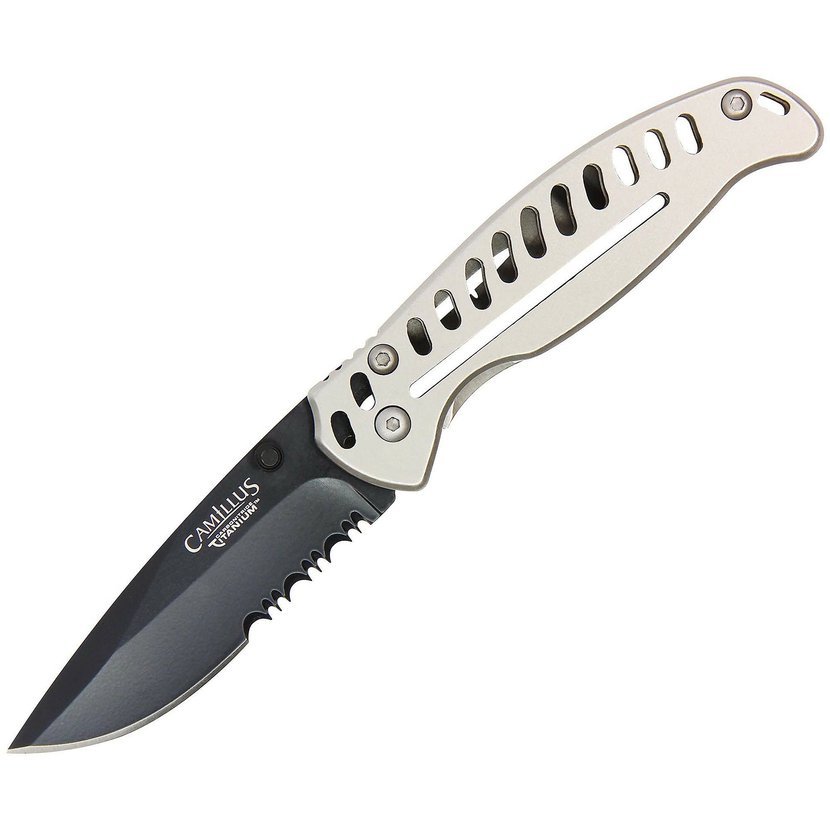 Zavírací nůž Camillus EDC3 je kompaktní a spolehlivý nástroj pro každodenní nošení, vyrobený pro výkon a odolnost. Celková délka 17 cm je tvořena čepelí s hrotem Drop Point vyrobenou z oceli AUS-8 s povlakem z karbonitridu titanu pro zvýšenou tvrdost a odolnost proti opotřebení. Částečně zoubkovaná, dutě broušená čepel nabízí všestrannost pro různé řezné úkoly, zatímco rukojeť z nerezové oceli s elegantní stříbrnou povrchovou úpravou poskytuje pohodlný úchop pro praváky a leváky. EDC3 je navržen pro bezpečné a snadné použití, je vybaven mechanismem Liner Lock a poskytuje vynikající držení ostří s tvrdostí dle Rockwella HRC56.